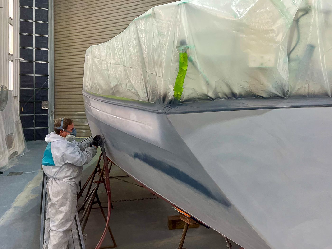 Before receiving its facelift, repairs were made to larger dings, scratches and cracks found on the vessel's hullsides. Multiple layers of primer were applied to fill minor imperfections before the vessel was cleaned and re-masked to receive three coats of Awlcraft 2000 Pantone Blue. The waterline was raised two inches to prevent damage to the new paint job, a project that included fresh cove and boot striping, as well as lettering for a new name: Aquasition.